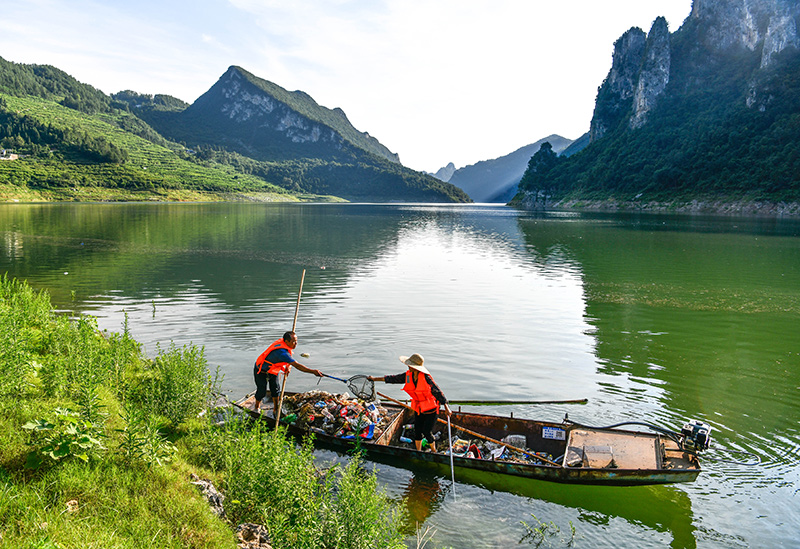 貴州省甕安縣珠藏鎮豐岩村村民盧錫永、冉茂英夫婦駕駛小船在烏江上打撈漂浮物(2023年7月10日攝)。