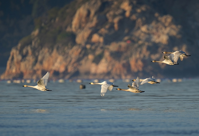 一群天鵝飛過閩江河口濕地上空(2023年1月31日攝)。