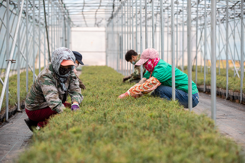 在黑龍江伊春森工集團紅鬆種苗繁育基地,工作人員在養護輕基質紅鬆苗(2023年5月20日攝)。