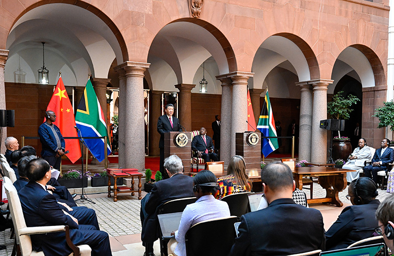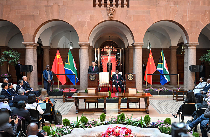 習近平指出,很高興應拉馬福薩總統邀請,再次對美麗的“彩虹之國”南非進行國事訪問。這是我作為中國國家主席對南非進行的第四次國事訪問。今年是中南建交25周年。25年來,中南關係實現跨越式發展,戰略互信達到新高度,各領域合作全麵推進,多邊協作更加緊密。中南關係遠遠超越雙邊範疇,越來越具有戰略意義和全球性影響。