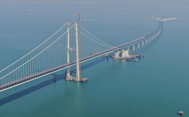 2023年11月28日,粵港澳大灣區超級工程深中通道主線正式貫通,這是深中通道伶仃洋大橋東塔及西人工島(無人機照片)。
