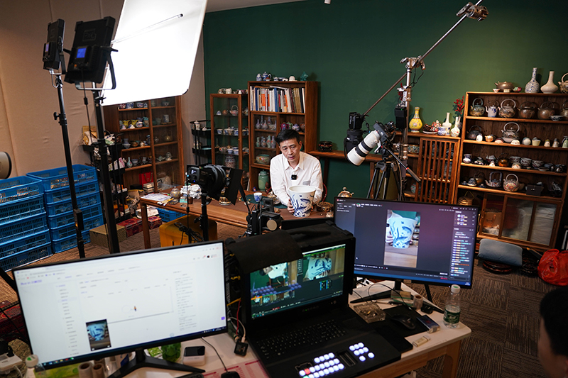 在江西景德鎮陶溪川文創街區的直播基地裏,工作人員通過網絡直播推介陶瓷產品(2023年2月22日攝)。