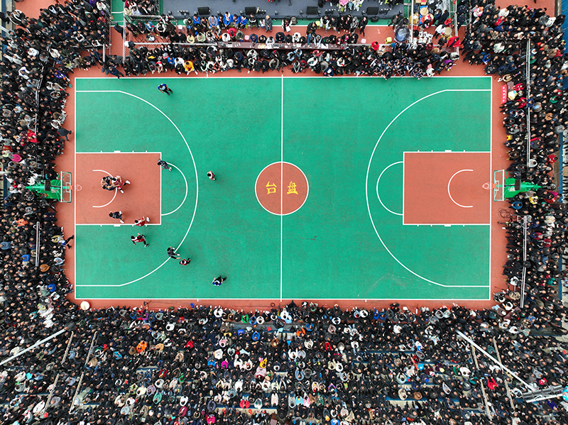 這是2023年3月27日在貴州省黔東南州台江縣台盤村拍攝的貴州省首屆“美麗鄉村”籃球聯賽總決賽比賽現場(無人機照片)。