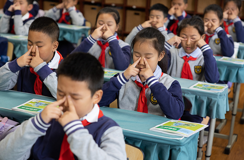 在四川省成都市迎賓路小學,四年級一班的同學們在課間做眼保健操(2023年11月17日攝)。