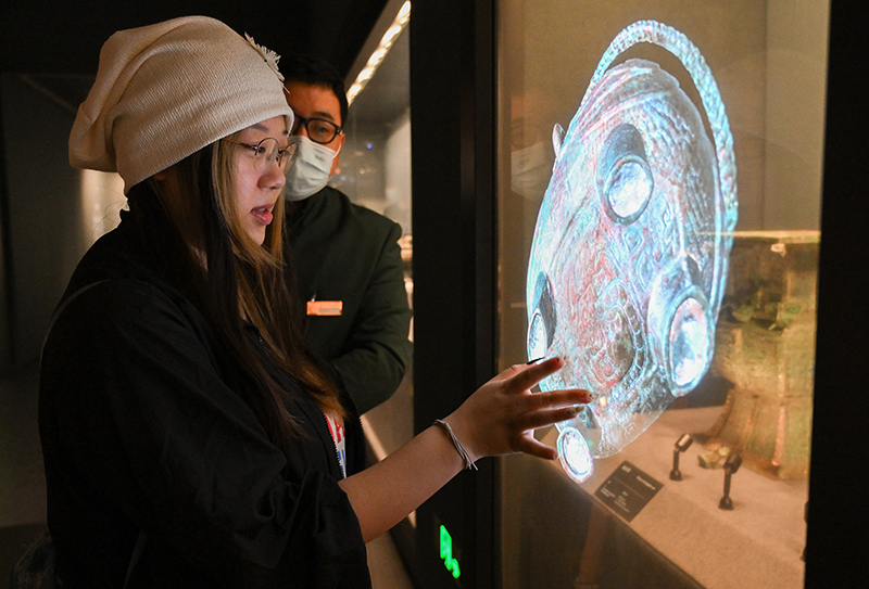2023年9月15日,觀眾在位於北京奧林匹克公園核心區的中國考古博物館內體驗互動屏幕。