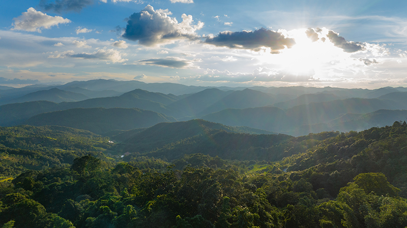 這是2023年9月16日拍攝的日落時分的雲南普洱景邁山風光(無人機照片)。