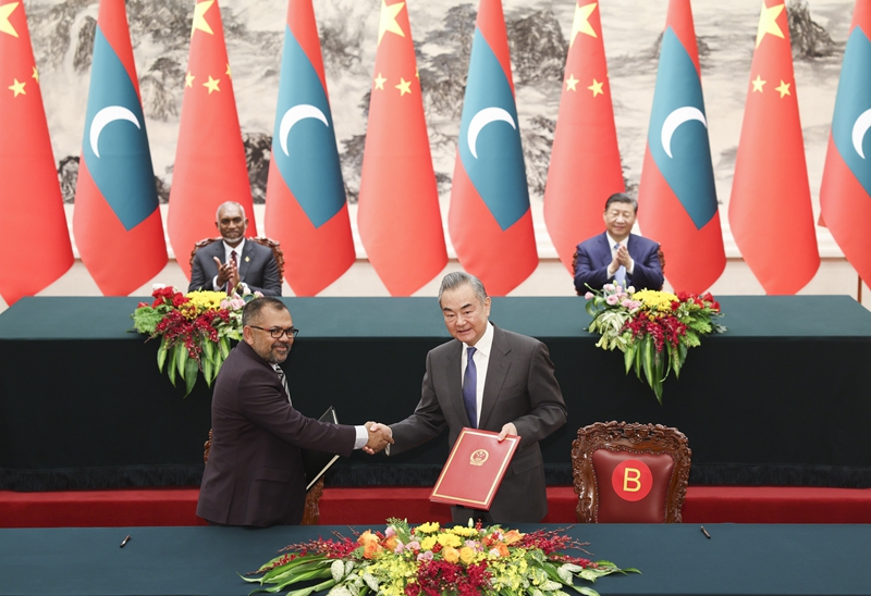 1月10日下午,國家主席習近平在北京人民大會堂同來華進行國事訪問的馬爾代夫總統穆伊茲舉行會談。這是會談後,兩國元首共同見證簽署雙邊合作文件。
