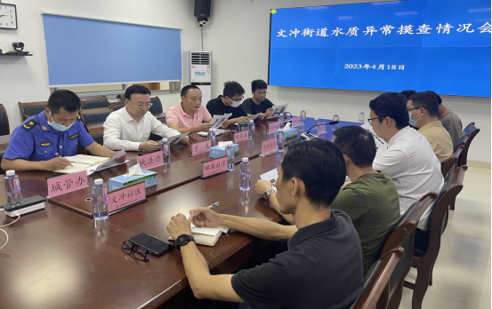 4月18日,文衝街道黨工委書記、總河長於龍組織召開文衝街水質異常摸查情況會議。會上要求各相關單位盡快落實整改措施。區水務局、街道二級調研員林鎮葵、區河湧所、市排水公司、城管辦、執法辦、文衝社區、萬科社區、瑞東社區相關負責人參加會議。