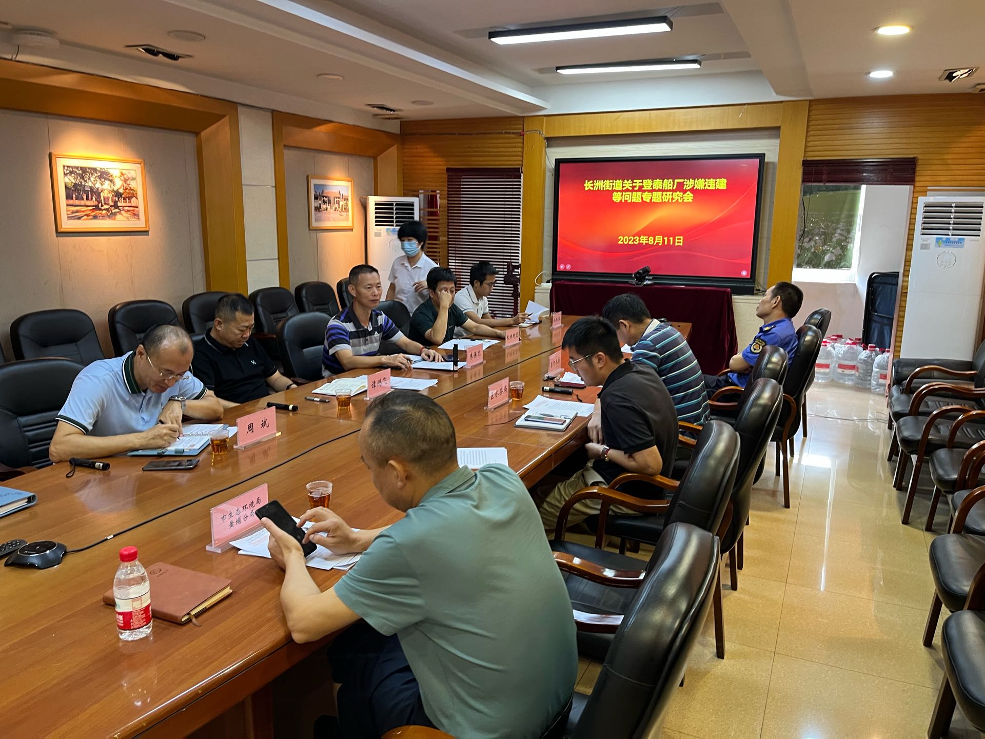 8月11日上午,長洲街道黨工委書記、總河長譚鴻飛組織召開長洲登泰船廠違建專題研究會,會上就登泰船廠違規搭建便橋及浮動船塢設施、違規排汙等事宜後續處置達成一致共識,堅決打擊水事違法行為,共同打造綠水青山。區河長辦、廣州市生態環境局黃埔分局、區城管局、水利科、長洲街河長辦、長洲街城管執法辦參加。