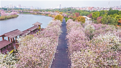 海珠濕地內,道路兩旁滿樹繁花,粉白相間蔚為壯觀