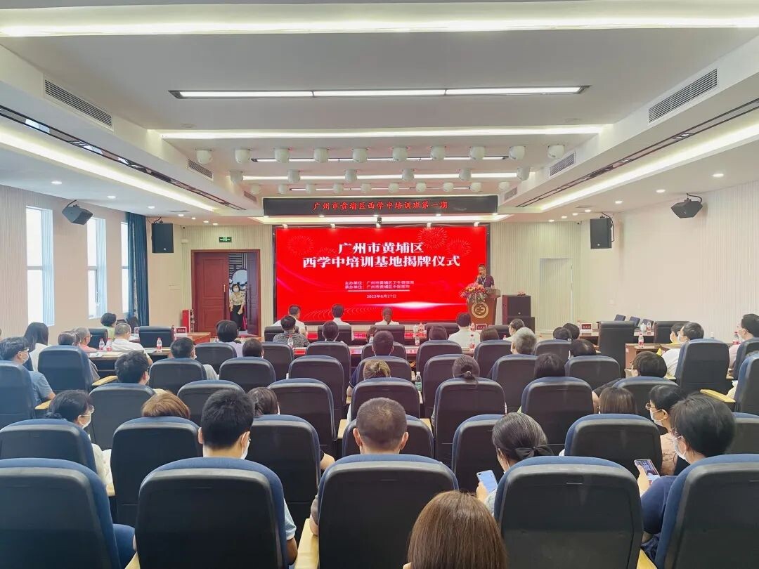 2023年6月27日,廣州市黃埔區西學中培訓基地揭牌儀式及第一期西學中培訓在黃埔區中醫醫院隆重舉行,邀請廣州中醫藥大學羅廣波教授開展授課培訓,區衛生健康局副局長鄧霞為培訓基地揭牌並作重要講話,醫院領導班子、全體中層幹部、各社區衛生服務中心負責人及“西學中”學生代表近150人參加會議。