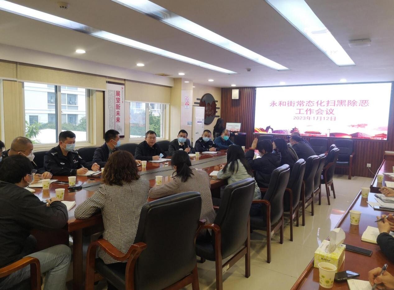 2023年1月12日,永和街黨工委書記鍾才雍在街道408會議室召開常態化掃黑除惡工作會議,強調各相關單位要認真貫徹中央和省委決策部署,全力推動常態化掃黑除惡鬥爭取得新的更大成效,努力建設更高水平的平安永和,為永和社會發展營造更加安全穩定的社會環境。