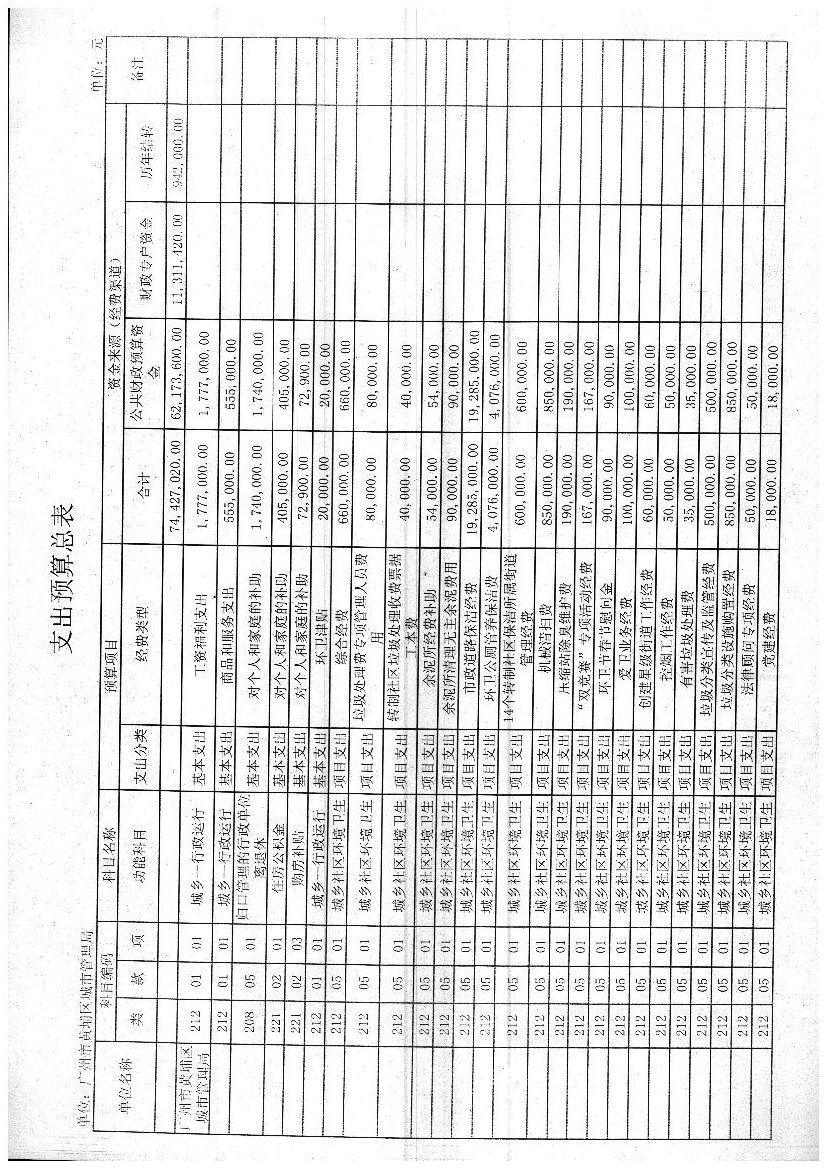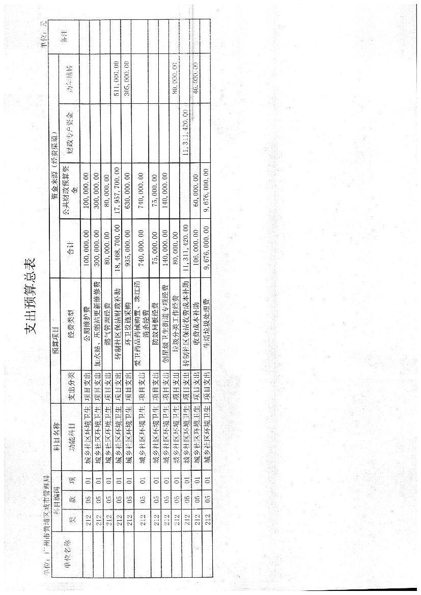 1.綜合經費66.00萬元;2.垃圾處理費專項管理人員費用8.00萬元;3.轉製社區垃圾處理收費票據工本費4.00萬元;4.餘泥所經費補助5.40萬元;5.餘泥所清理無主餘泥經費9.00萬元;6.市政道路保潔經費1,928.50萬元;7.環衛公廁管養保潔費407.60萬元;8.14個轉製社區保潔所屬街道管理經費60.00萬元;9.環衛設施采購93.50萬元;10.機械清掃費85.00萬元;11.壓縮站除臭維護費19.00萬元;12.“雙競賽”專項活動16.70萬元;13.環衛節春節慰問金9.00萬元;14.愛衛業務經費10.00萬元;15.創建星級街道工作經費6.00萬元;16.創星級衛生街道經費14.00萬元;17.控煙工作經費5.00萬元;18.有害垃圾處理費3.50萬元;19.垃圾分類宣傳及監管經費50.00萬元;20.垃圾分類設施購置經費85.00萬元;21.法律顧問專項經費5.00萬元;22.黨建經費1.80萬元;23.愛衛藥品藥械購置、珠江湧消殺經費74.00萬元;24.防蚊閘板經費7.50萬元;25.公廁維護費10.00萬元;26.加水站、壓縮站更新維修費30.00萬元;27.燃氣管理經費8.00萬元;28.轉製社區保潔財政補助1,846.87萬元;29.轉製社區保潔收費成本補助1,131.14萬元;30.收費成本補助10.60萬元。