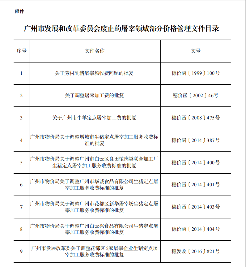 附件:廣州市發展和改革委員會廢止的屠宰領域部分 價格管理文件目錄