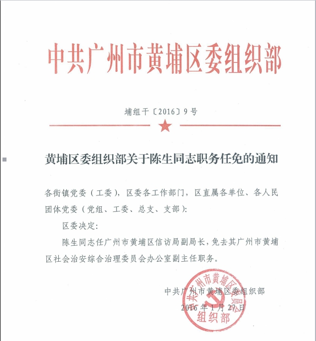 黃埔區委組織部關於陳生同誌職務任免的通知