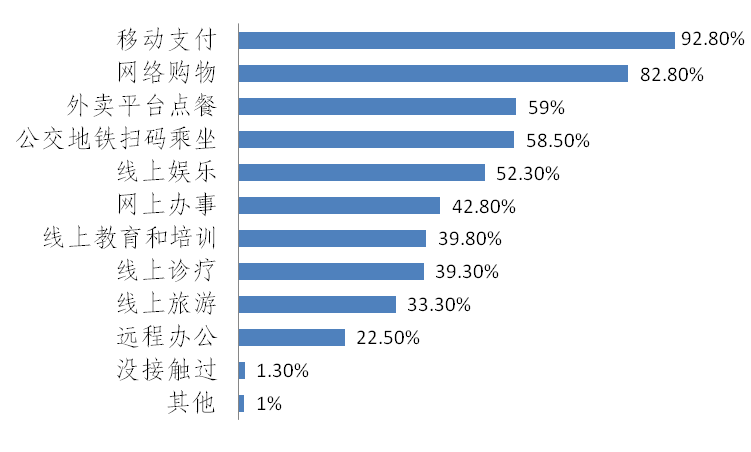 另外,線上教育和培訓占39.8%、線上診療占39.3%、線上旅遊占33.3%、遠程辦公占22.5%,為抵抗突如其來的新冠肺炎病毒,線上教育培訓、線上診療、遠程辦公、線上旅遊等使許多人渡過了病毒肆虐的寒冬,不出門完成了學業,不出門可看病,不出門可上班,不出門在家充電,不出門周遊列國,減少了疫情帶來的損失。