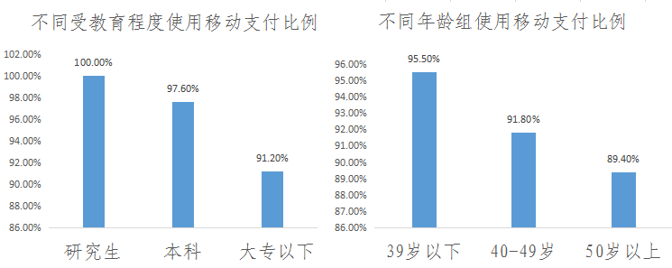 其中,移動支付最多人使用,占92.8%,分組來看,39歲以下及高學曆居民使用移動支付比例最高,年輕人體驗過的達95%以上,本科以上學曆市民體驗過的達98%以上(見圖2),表明年輕人及高曆學曆居民生活消費智能化已接近全覆蓋,現金支付方式將逐漸被淘汰,無幣化生活、數字貨幣已成趨勢並主導生活,出門可以不帶錢,但必須帶手機。我們再也不會沾上“銅臭味”,生活品質也相應提高。