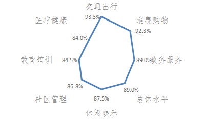 市民對於交通出行、消費購物、政務服務方麵的信息化水平認可度高,分別達93.3%、92.3%、90%。對休閑娛樂(87.5%)、社區管理(86.8%)、教育培訓(84.5%)、醫療健康(84%)等方麵的信息化水平評價相對較低,有待進一步加強(見圖3).