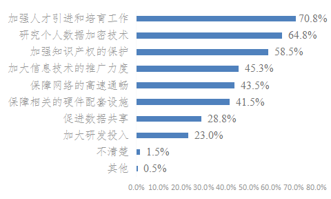 在提到“您擔心數字信息化帶來哪些問題”時,對“個人信息泄露”選項,有90.3%的市民表示擔心。如在“利用數字信息技術提高生活品質應做好的工作”選項中,“研究個人數據加密技術”也占到了64.8%(見圖4)。說明了“加密”二字對於信息使用的重要性,許多人擔心移動支付和網上購物將個人的私密無保留地泄露在平台上,這也是個別人不願意移動支付的原因。在大數據時代,“個人沒有隱私”會不會成為現實,這將是個人數據加密技術要回答的問題。要讓個人在享受數字信息技術便利的同時,又不擔憂信息泄露。