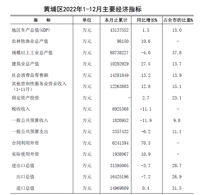 2022年12月黃埔區主要經濟指標