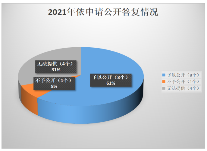 (二)依申請公開依法規範。暢通受理渠道、精準規範答複意見,建立公開機製,進一步提升依申請公開辦理質量。全年新收到政府信息公開申請13件,辦結13件,結轉下年辦理0件,全年無行政複議、行政訴訟情況。
