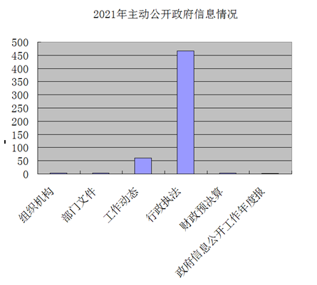 (一)主動公開情況。2021年,我局嚴格落實政務公開工作要求,以依法行政、提高效能、建設服務型政府為目標,做到了規範管理,定期更新,確保信息公開的時效性。全年共主動公開信息538條,其中組織機構信息3條,部門文件4條,工作動態類信息60條,行政執法方麵信息467條(行政處罰90條、行政許可264條,其他具體行政行為111條,行政檢查2條),財政預決算信息3條,政府信息公開工作年度報告1條。