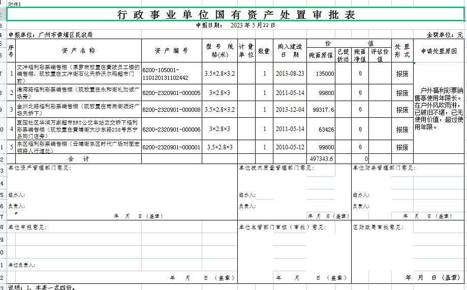 原黃埔區民政局和原蘿崗區社會管理局於2010年5月至2013年12月先後向廣州市福利彩票發行中心申請經費購製5個即開型福利彩票戶外銷售亭(棚)並放置在文衝、港灣路、金洲北路、夏園及東區等處開展“刮刮樂”即開型福利彩票戶外銷售,現因福利彩票戶外銷售亭(棚)風吹雨淋,已破舊不堪,無維修和使用價值。為加強固定資產管理,根據《廣州市黃埔區 廣州開發區區屬行政事業單位國有資產處置辦法》(穗埔財規字﹝2018﹞2號)有關規定,我局擬將此5個即開型福利彩票銷售棚(福利彩票戶外銷售亭)進行報廢處置,該批資產賬麵總值人民幣497343.6元,詳見下表: