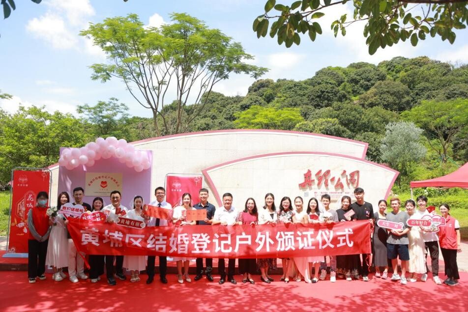 6月30日上午,在中國共產黨成立102周年的前夕,黃埔區民政局婚姻登記處在真理公園舉行“花城有喜.黃埔有愛”的結婚登記戶外頒證儀式,見證一批新人攜手走進幸福婚姻的殿堂。特邀嘉賓為當天喜結良緣的8對新人頒發了結婚證書和手寫婚書。區民政局副局長陳凱燕致辭時,向新人們致以了衷心的祝福,祝新人們在幸福婚姻的旅程中追求真理、共同進步,在這個偉大的時代開創美好的未來。她表示,黃埔區民政局正著手布局更多更美的戶外頒證場所、建立戶外頒證製度、評選黃埔區“十個最美戶外頒證場所”,通過結婚登記戶外頒證,增強結婚登記的幸福感、儀式感,弘揚文明新風尚、展示黃埔新風貌、讓“到黃埔去成家立業”成為新時代年輕人的新向往、新風尚