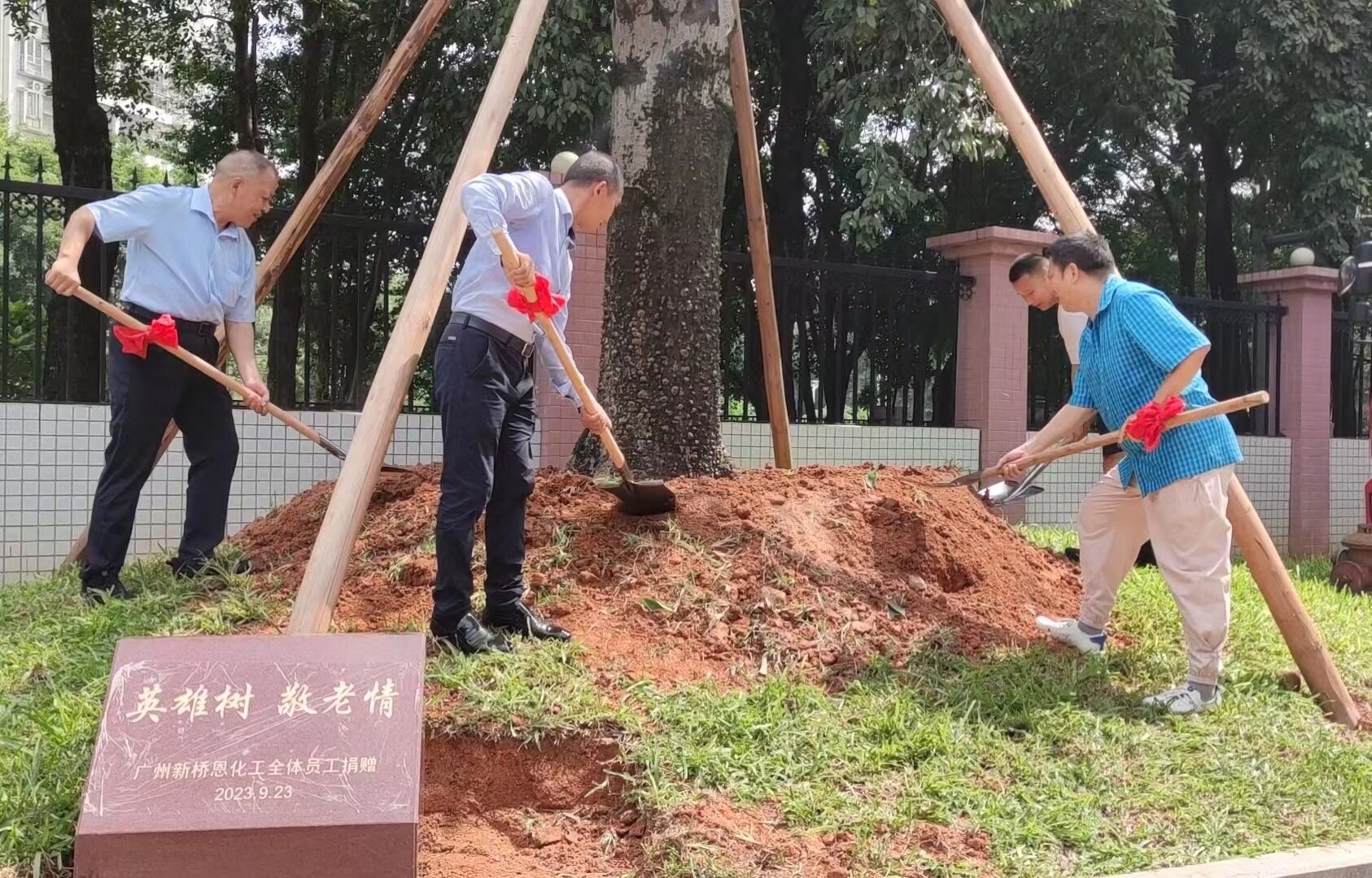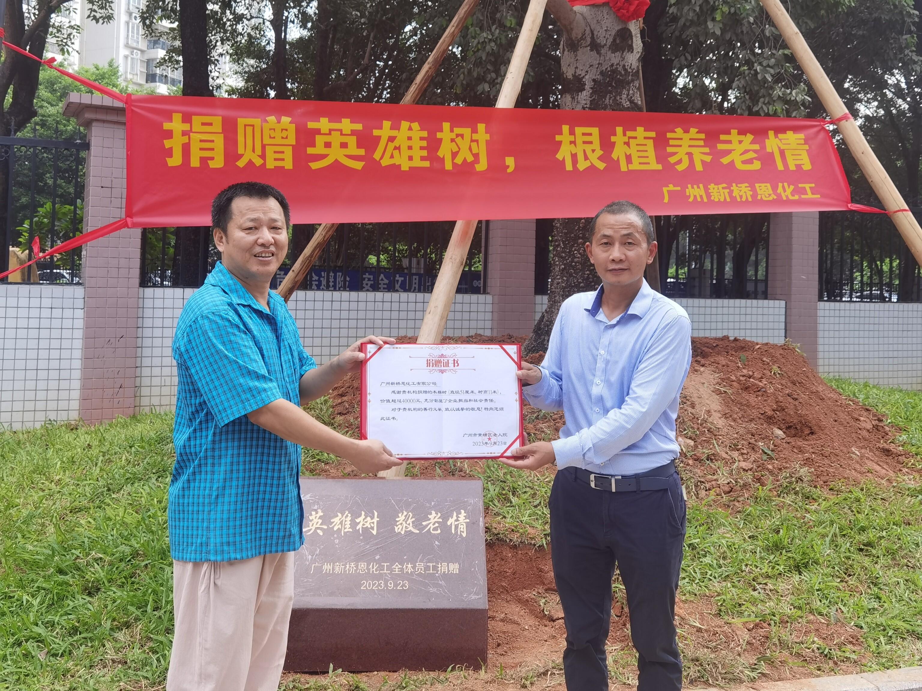 紅棉丹煉滿身痂,熱血一腔化赤霞。突兀巍峨插鐵塔,千年絕唱英雄花。——木棉樹曆來被人們視為英雄的象征,因此又得名“英雄樹”。2023年9月23日,廣州新橋恩化工有限公司通過黃埔區慈善會向黃埔區老人院捐贈一顆高大挺拔的木棉樹,表達對老年人的敬佩之情與美好祝福。